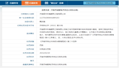 因违反扬尘污染防治有关规定,济南地平西棠甲第D地块项目室外景观、官网工程施工方济南银丰科耀建筑工程有限公司日前遭监管部门处罚。