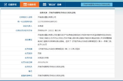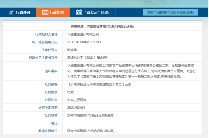华洲建设温州公司则在重污染天气应急响应期间在济南农产品贸易中心(海那城)商务公寓区二期、三期室外园林绿化、园建项目时违规进行土方施工,现场大面积裸土未覆盖。二者上述行为均违反了《济南市扬尘污染防治管理规定》第十一条第二款规定,济南市城管局(市综合行政执法局)依据《济南市扬尘污染防治管理规定》第二十三条规定,对两家企业分别罚款10万元。
