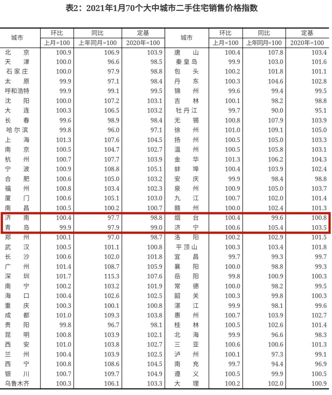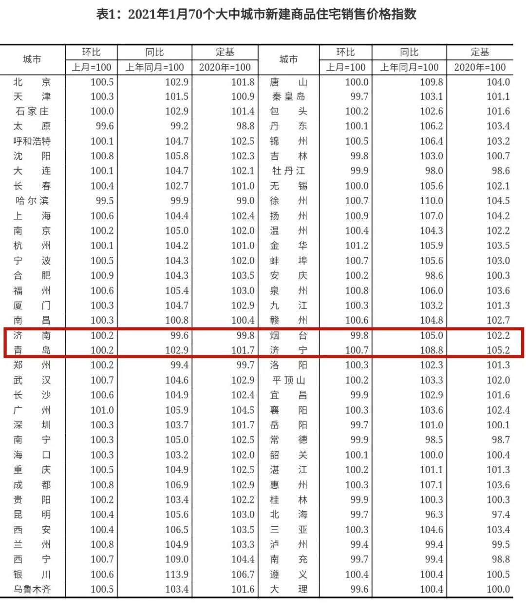 2月23日,国家统计局发布2021年1月份70个大中城市商品住宅销售价格变动情况,总体来看,今年1月份房地产市场运行总体平稳,各线城市商品住宅销售价格环比涨幅较上月有所扩大,同比涨幅有扩有落。从具体数据来看,山东纳入统计的济南、青岛、烟台、济宁4市,济南、青岛新房均出现小幅上涨,青岛二手房五连降。