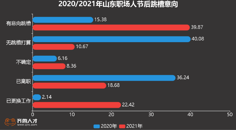 齐鲁人才网于2021年2月18日面向山东5万名职场人发布问卷,就其节后跳槽意向进行了调查。数据如上图所示,2021年节后山东职场人普遍对节后求职招聘行情秉承乐观态度,39.87%的职场人有意向跳槽;8.36%的职场人表示不确定并处于观望态势;无跳槽打算者仅占10.67%;另有18.68%的职场人已经离职,更有22.42%的职场人已经更换工作。同比2020年同期数据来看,选择有意向跳槽和已更换工作的职场人出现大幅增加,。