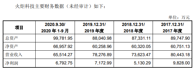 企查查显示,火炬科技系由株洲湘火炬火花塞有限责任公司整体变更设立的股份有限公司,注册资本3亿元。据此次公告,火炬科技主营业务为火花塞及部件、点火线圈及部件和汽车水封及水泵等产品的设计、研发、制造和销售,其主要产品和业务属于汽车零部件行业的下属细分行业。业绩方面,2020年前三季度,火炬科技实现营业收入65514.27万元,净利润6792.75万元,总资产99781.95万元,净资产66957.92万元。