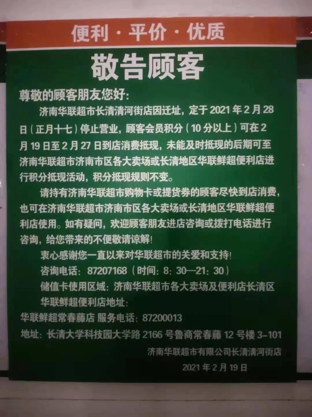 2月19日,济南华联超市长清清河街店发布《敬告顾客》通知,宣布该店因迁址将于2月28日停止营业。鲁网·泰山财经记者致电获悉,店里工作人员也是在通知贴出当天才得知闭店的消息,而且员工的去留问题至今没有一个明确的说法。