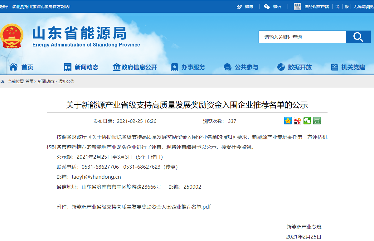 近日,山东省能源局发布公告称,按照省财政厅《关于协助报送省级支持高质量发展奖励资金入围企业名单的通知》要求,新能源产业专班委托第三方评估机构对各市遴选推荐的新能源产业龙头企业进行了评审,现将评审结果予以公示,接受社会监督。公示期截止到3月3日。