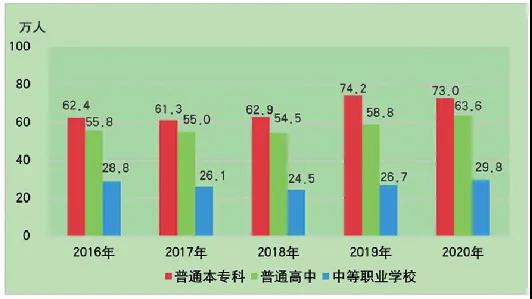 图21:2016-2020年普通本专科、普通高中、中等职业学校招生人数