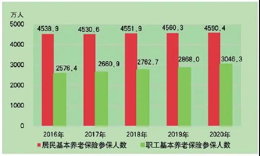 图20:2016-2020年居民、职工基本养老保险参保人数