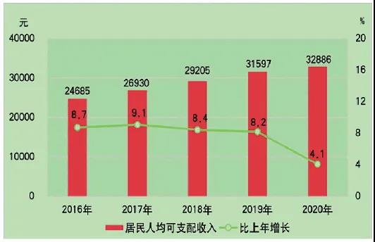 居民生活质量持续提高。居民人均可支配收入32886元,比上年增长4.1%;人均消费支出20940元,增长2.5%。其中,城镇居民人均可支配收入43726元,增长3.3%;人均消费支出27291元,增长2.1%。农村居民人均可支配收入18753元,增长5.5%;人均消费支出12660元,增长2.9%。居民人均现住房建筑面积40.0平方米,其中城镇、农村居民分别为37.3平方米和43.4平方米。