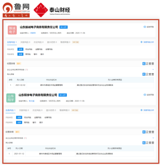 据德城市监异列字【2021】01号、06号公告显示,山东阳宇电子商务有限责任公司(以下简称“阳宇电商”)、山东振诚电子商务有限责任公司(以下简称“振诚电商”)都因通过登记的住所或者经营场所无法联系,违反了《企业信息公示暂行条例》和《经营异常名录管理暂行办法》的相关规定。被德州市德城区市场监督管理局列入经营异常名录。