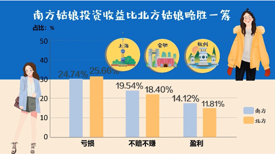 大调查还通过南北方女性证券市场投资对比发现,南方姑娘更会精打细算,投资收益比北方姑娘略胜一筹。36个大中城市中,上海、合肥、杭州这三个城市的女性投资盈利比例最高。