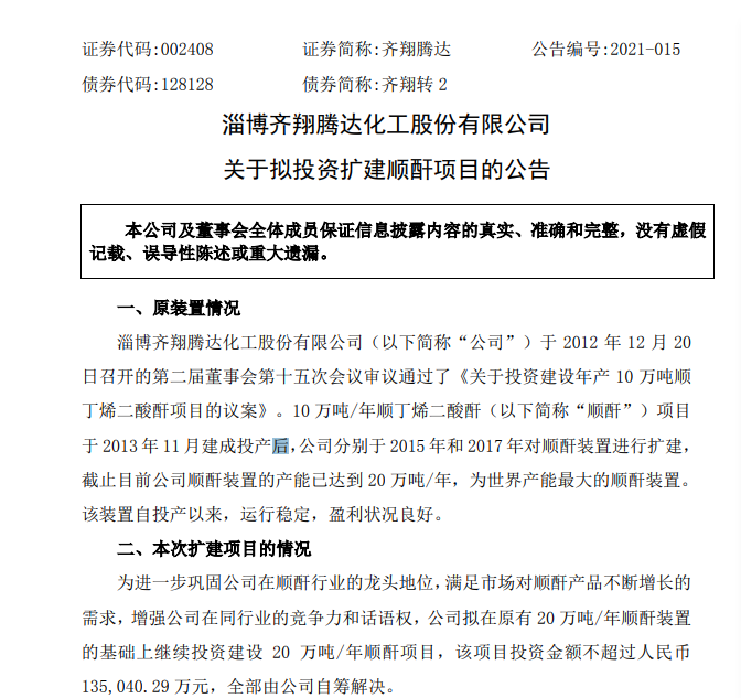日前,深交所上市公司淄博齐翔腾达化工股份有限公司(齐翔腾达.002408.SZ)发布关于拟投资扩建顺酐项目的公告。拟在原有20万吨/年顺酐装置的基础上继续投资建设20万吨/年顺酐项目,该项目投资金额不超过人民币135040.29万元,全部由公司自筹解决。
