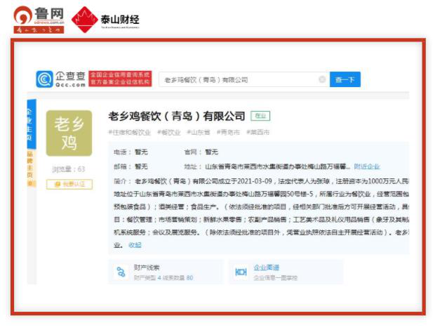 3月9日,企查查显示,老乡鸡餐饮(青岛)有限公司已注册成立,法定代表人为张琼,注册资本为1000万元人民币,经营范围包含餐饮服务、保健食品销售等,目前的经营状态为在营(开业)企业。鲁网·泰山财经记者 冯明月