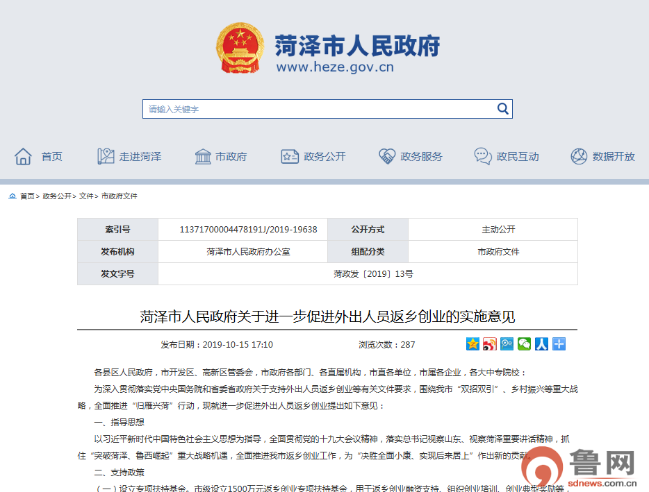 菏泽市政府近日发布《关于进一步促进外出人员返乡创业的实施意见》(以下简称“菏泽20条”)全面推进全面推进“归雁兴菏”行动,鼓励菏泽在籍在外企业家、大中专毕业生、农民工、科技人员和政商界、科教界退休人员返乡就业创业。鲁网记者梳理发现,这并不是菏泽市第一次出台这种政策,从2015年开始至今,已连续第四次出台“归雁兴菏”计划。值得注意的是,距离菏泽市不远的聊城市,也在本月出台十分相似的“归雁计划”。去年,五莲县也推出了“莲才兴乡”计划。
