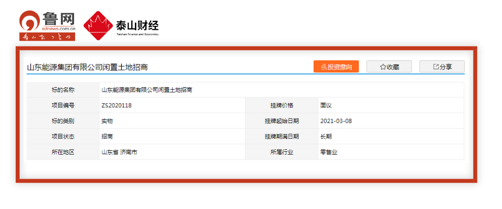 今日,鲁网·泰山财经记者从山东产权交易中心获悉,山东能源集团有限公司(简称“山东能源集团”)旗下109宗闲置土地拟招商,总面积893.73万平方米,账面价值16.06亿元。山东能源集团表示,本次招商可通过租赁、转让或作价出资等方式合作。