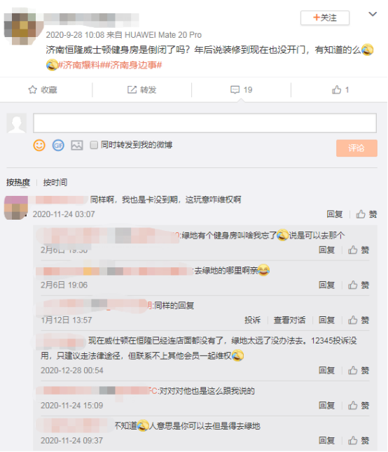鲁网·泰山财经记者注意到,有很多消费者曾在微博留言称威仕顿健身关店,但是健身卡还未到期,并寻求维权。鲁网·泰山财经记者也曾电联威仕顿健身工作人员,但接听人员王先生表示拒绝采访。(鲁网·泰山财经记者 徐文轩)