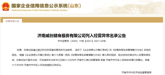 近日,鲁网·泰山财经记者从国家企业信用信息公示系统(山东)官网获悉,济南威创健身服务有限公司(以下简称“威创健身”)被列入企业经营异常名录。