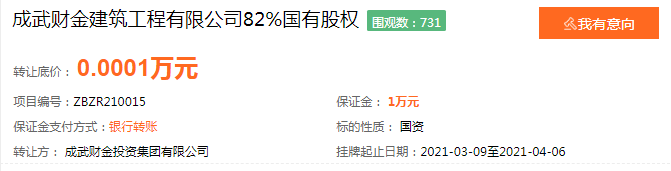 9日,山东产权交易中心公告称,成武财金建筑工程有限公司82%股权将被转让,底价仅为1元,其转让方为成武县国有资产管理局(简称“成武县国资局”)全资子公司成武财金投资集团有限公司,转让期截至4月6日,为期20个工作日。