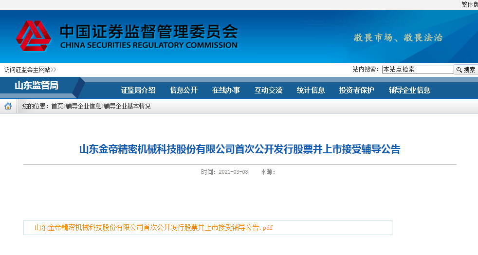 今天,鲁网·泰山财经记者于中国证券监督管理委员会山东监管局获悉,山东金帝精密机械科技股份有限公司(以下简称“金帝精密”)拟登陆A股,已于2021年2月26日与国信证券签署辅导协议。