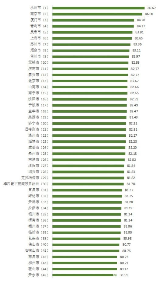 鲁网·泰山财经记者注意到山东参与的7个城市得分均在80分以上,省内第四名为济宁市,得分为83.32分,全国排名20位,淄博市、潍坊市、临沂市,分别以82.23分、81.35分、81.05分位列全国23、32、38位,省内5、6、7位。
