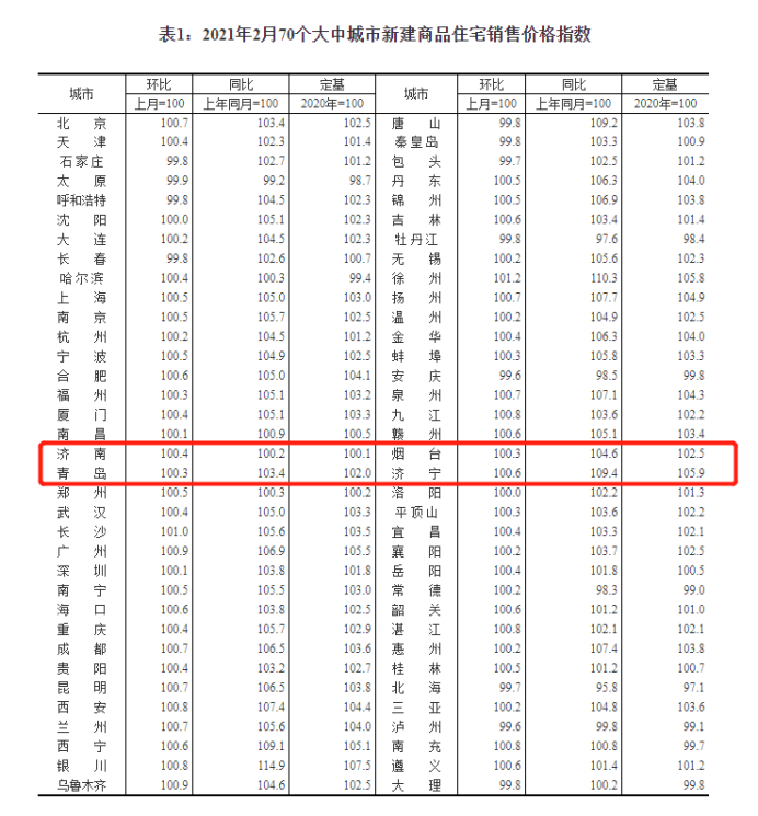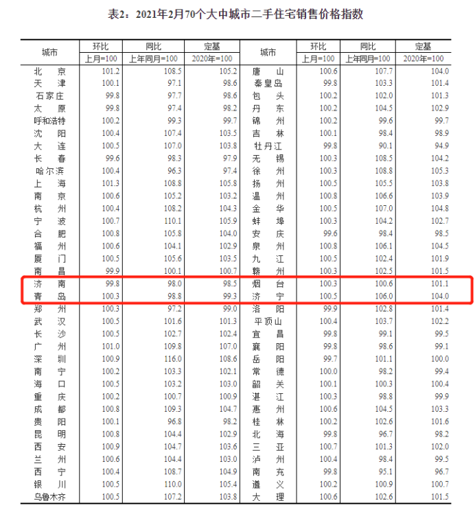 3月15日,国家统计局发布2021年2月份70个大中城市商品住宅销售价格变动情况统计数据。济南青岛等城市新房价格继1月份小幅上涨后,2月份继续回温,二手房价格2月份则有所回落。