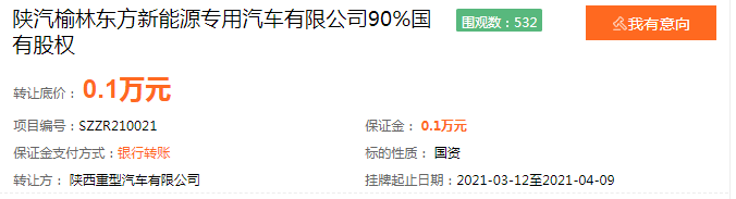 底价1千元,山东重工集团有限公司(简称“山东重工”)确认转让陕汽榆林东方新能源专用汽车有限公司(简称“陕汽榆林东方新能源公司”)90%国有股权。转让方为山东重工控股企业陕西重型汽车有限公司(简称“陕西重汽”),挂牌时间截止至4月9日。