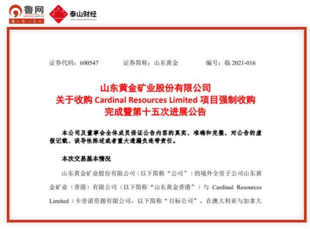 16日,山东黄金矿业股份有限公司(山东黄金.600547.SH)关于收购CardinalResourcesLimited项目强制收购完成暨第十五次进展公告发布。