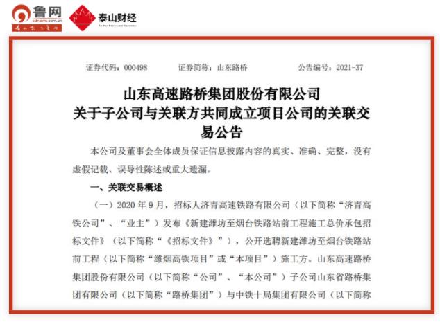 鲁网·泰山财经记者了解到,2020年9月,招标人济青高速铁路有限公司(以下简称“济青高铁公司”、“业主”)发布《新建潍坊至烟台铁路站前工程施工总价承包招标文件》,公开选聘新建潍坊至烟台铁路站前工程(以下简称“潍烟高铁项目”)施工方。山东高速路桥子公司山东省路桥集团有限公司(以下简称“路桥集团”)与中铁十局集团有限公司(以下简称“中铁十局”)组成联合体参与了潍烟高铁项目WYTLSG-1标段项目投标,并响应招标文件要求,承诺根据标段拟承担的施工工程量投资2.99亿元。2020年10月28日,路桥集团与中铁十局组成的联合体被确定为潍烟高铁项目WYTLSG-1标段中标方,中标金额20.96亿元。经过对联合体中标工程量拆分,路桥集团中标工程量为16.96亿元,对应投资额为24227万元。