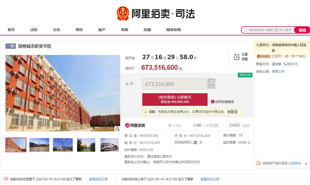 据“阿里拍卖”显示,2021年4月12日10时至4月13日10时,郑州城市职业学院将上线阿里拍卖,由河南省郑州市中级人民法院负责处置,拍卖内容包括全部资产和作为出资人、举办者所享有的一切权利。这一标的的估价和起拍价都是6.73亿元,保证金6000万元,加价幅度20万元。目前已经有超过2.6万人围观。