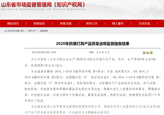 近日,山东省市场监督管理局发布2020年防爆灯具产品质量省级监督抽查结果公告,鲁网·泰山财经记者注意到在本次抽查中山东华鼎伟业能源科技股份有限公司(华鼎伟业.832736.OC)、邹城市东风人电器有限公司(以下简称“东风人电器”)2家企业的2批次产品不符合相关标准的要求。