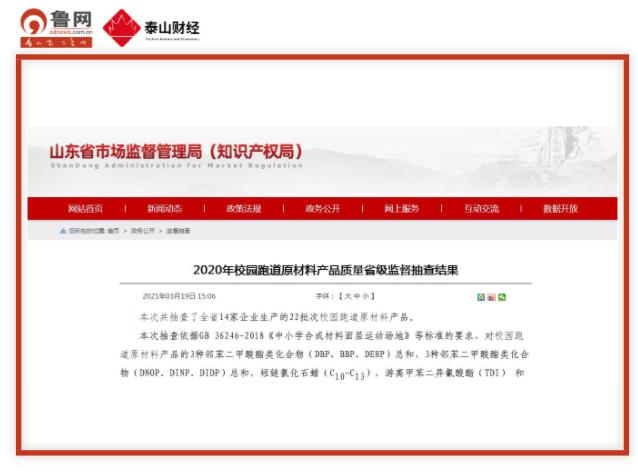 近日,山东省市场监督管理局公布了2020年校园跑道原材料产品质量省级监督抽查结果,本次共抽查了全省14家企业生产的22批次校园跑道原材料产品,其中青岛和谐塑胶有限公司、青岛绿苑塑胶铺装工程有限公司、青岛永康体育设施有限公司3家企业的3批次产品不符合相关标准的要求,不合格项目为高聚物总量项目。不合格产品分别为青岛和谐塑胶有限公司和青岛永康体育设施有限公司的校园跑道原材料(EPDM塑胶颗粒)、青岛绿苑塑胶铺装工程有限公司的校园跑道原材料(绿色颗粒)。