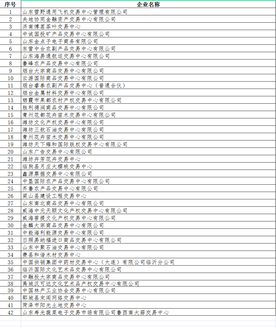据了解,山东雪野通用飞机交易中心管理有限公司、央地协同金融资产交易中心有限公司、济南博茗茶叶交易中心、中诚国投矿产品交易中心有限公司、山东金点子电子商务有限公司等42家交易场所上黑榜。鲁网·泰山财经记者 于雅雯