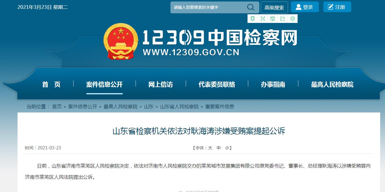 今日,鲁网·泰山财经记者在12309中国检察网获悉,日前,山东省济南市莱芜区人民检察院决定,依法对济南市人民检察院交办的莱芜城市发展集团有限公司原党委书记、董事长、总经理耿海涛以涉嫌受贿罪向济南市莱芜区人民法院提出公诉。