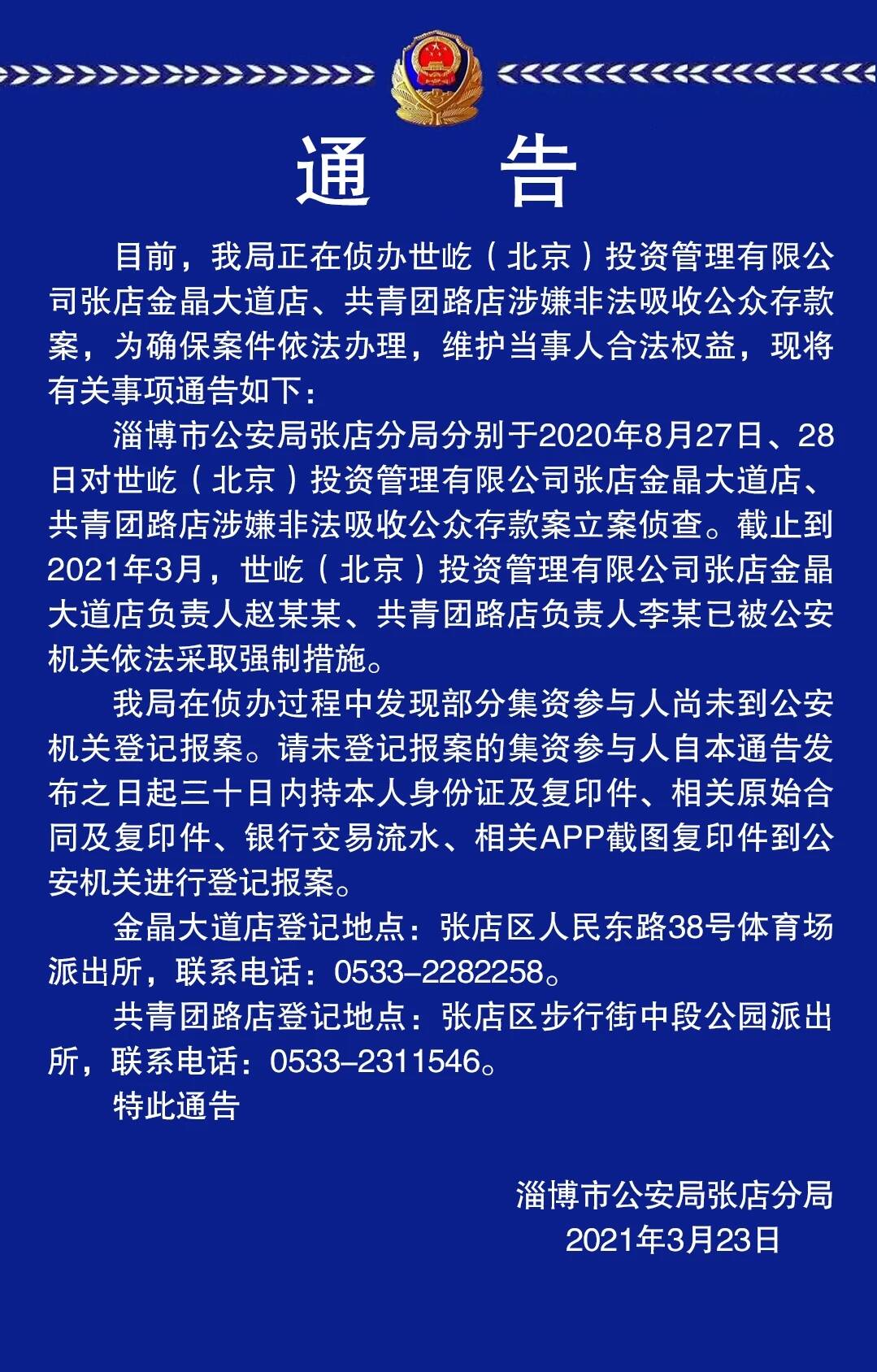 3月23日,淄博市公安局张店分局发布通告,世屹(北京)投资管理有限公司张店金晶大道店、共青团路店涉嫌非法吸收公众存款,部分未登记的集资参与人请30日内到公安局登记报案。
