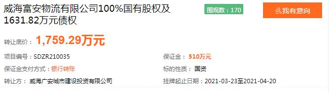 23日,威海广安城市建设投资有限公司发布公告,拟转让威海富安物流有限公司(简称“富安物流”)100%股权及1631.82万元债权,转让时间为3月23日至4月20日。