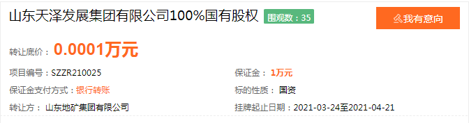 今日,鲁网·泰山财经记者从山东产权交易中心获悉,山东天泽发展集团有限公司(简称“山东天泽发展集团”)100%股权,将以1元底价被山东地矿集团有限公司(简称“山东地矿集团”)转让,转让期截止至4月21日,为期20天。