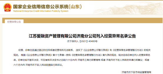 据历下异列入【2021】40480号公告显示,江苏爱融资产管理有限公司济南分公司(以下简称“济南爱融资产管理”)因通过登记的住所或者经营场所无法联系,违反了的相关规定。被济南市历下区市场监督管理局被列入经营异常名录。