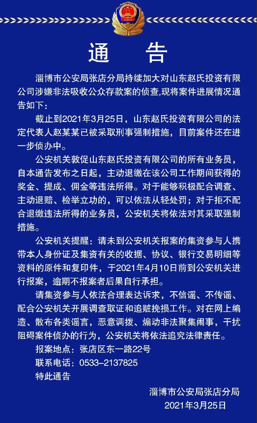 3月25日,淄博市公安局张店分局发布一则通告,山东赵氏投资有限公司涉嫌非法吸收公众存款,截至目前,该公司法定代表人赵某某已被采取刑事强制措施,目前案件还在进步侦办中。