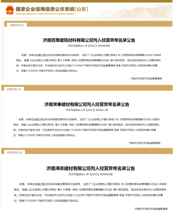 据济天市监异决入字【2021】4090008号、4090011号、4090026号公告显示,济南百惠建筑材料有限公司(以下简称“百惠建材”)、济南常秦建材有限公司(以下简称“常秦建材”)、济南涛澎建材有限公司(以下简称“涛澎建材”)因通过登记的住所或者经营场所无法联系,违反了《企业信息公示暂行条例》和《经营异常名录管理暂行办法》的相关规定。济南市天桥区市场监督管理局将以上3家企业列入经营异常名录。