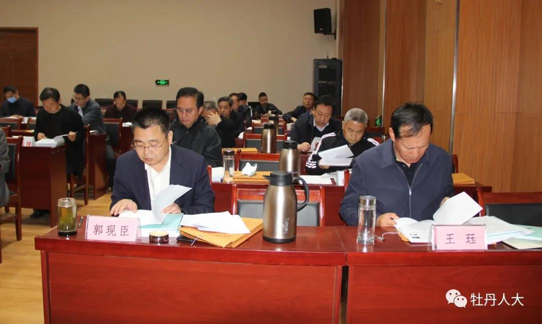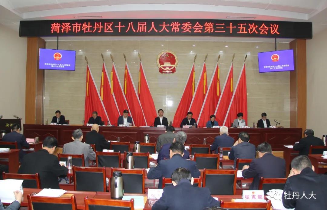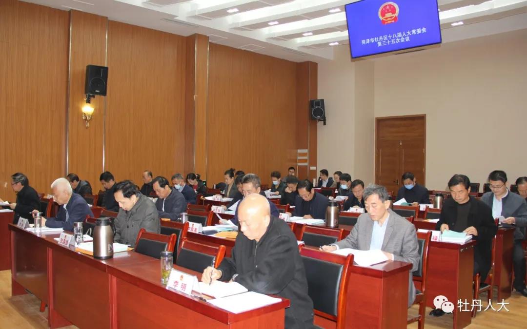 2021年3月29号,牡丹区十八届人大常委会第三十五次会议在区公务大厦一楼第二会议室召开。区人大常委会主任李书京主持会议。区人大常委会副主任李希靖、王晓梅、李哲、油凤莲及委员共计37人出席会议,符合法定人数。