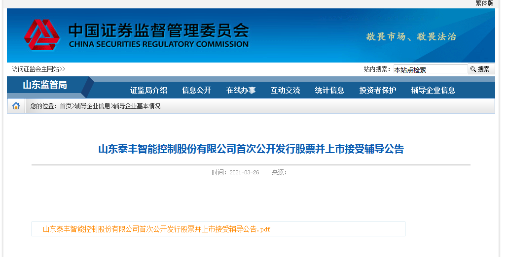 近日,中国证券监督管理委员会山东监管局(以下简称“山东证监局”)官网发布公告称,山东泰丰智能控制股份有限公司(以下简称“泰丰智能”)已于3月19日与长城国瑞证券有限公司(以下简称“长城国瑞”)签订首次公开发行股票并上市辅导协议。
