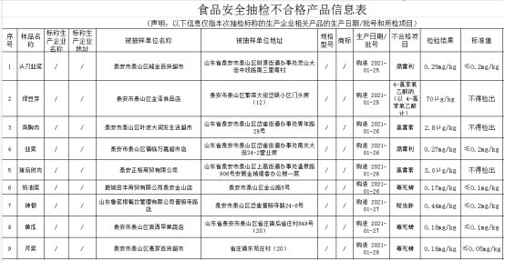 据悉,泰安市市场监督管理局本次对食用农产品、水产制品、水果制品等28大类食品239批次样品进行了监督抽检,其中,230批次样品抽检检验项目合格,9批次样品不合格。鲁网·泰山财经记者注意到本次不合格样品为农兽药残留超标问题。
