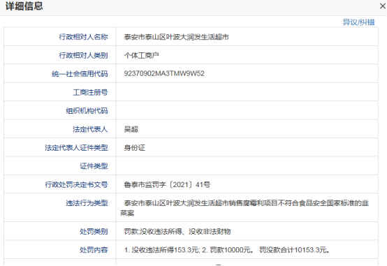 鲁网·泰山财经记者了解到,这并不是泰安大润发所售食品第一次检测出农兽药残留超标问题。据悉,3月1日,泰安市市场监督管理局曾发布鲁泰市监罚字〔2021〕41号处罚公告称,泰安大润发生活超市销售腐霉利项目不符合食品安全国家标准的韭菜,被泰安市市场监督管理局没收违法所得153.3元并罚款1万元。