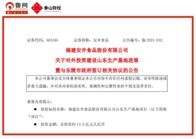 公告显示,安井食品于2021年3月26日召开的第四届董事会第十四次会议审议通过了《关于对外投资建设山东生产基地项目的议案》,同意公司以13.6亿元人民币投资建设山东生产基地项目。