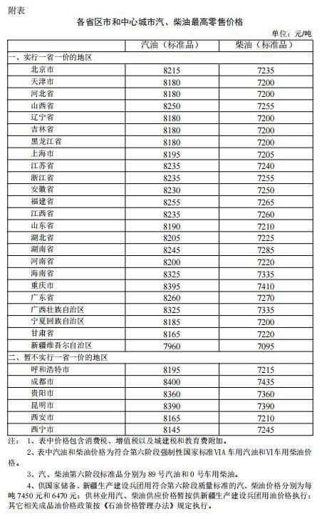公告显示,根据近期国际市场油价变化情况,按照现行成品油价格形成机制,自2021年3月31日24时起,国内汽、柴油价格(标准品,下同)每吨分别降低225元和220元。调整后,各省(区、市)和中心城市汽、柴油最高零售价格见附表。相关价格联动及补贴政策按现行规定执行。