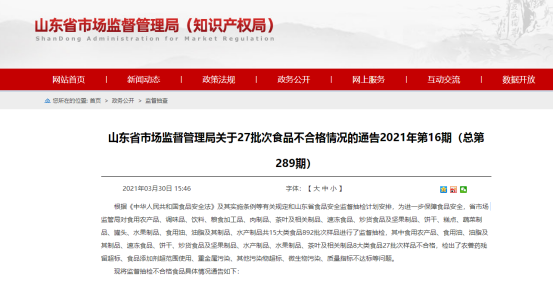 据悉,山东省市场监督管理局本次对食用农产品、调味品、饮料等15大类食品892批次样品进行了监督抽检,其中,食用农产品、食用油、油脂及其制品等8大类食品27批次样品不合格,检出了农兽药残留超标、食品添加剂超范围使用、重金属污染、其他污染物超标、微生物污染、质量指标不达标等问题。