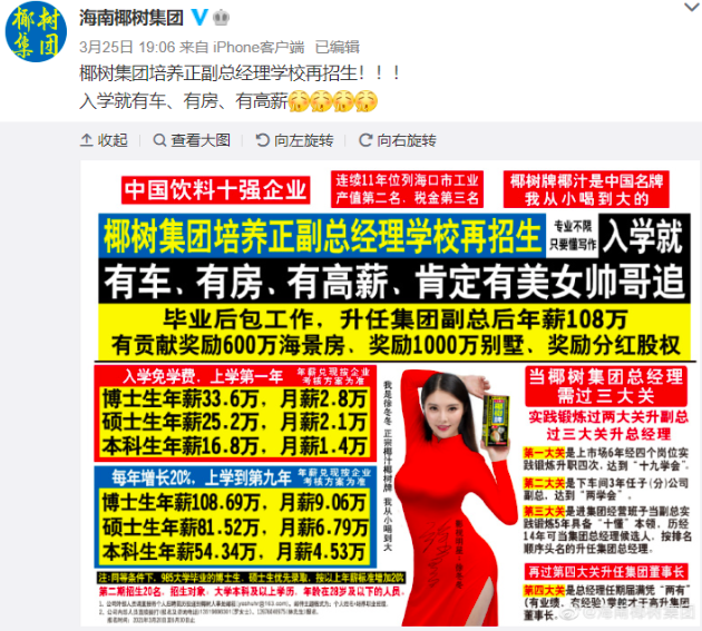 椰树集团通过官方微博在3月25日发布广告,这则“椰树集团培养正副总经理学校再招生”的广告,里面声称“入学就有车、有房、有高薪,肯定有美女帅哥追”的内容引发了广泛争议。3月31日,《海南日报》报道称,海南省市场监管局对椰树集团相关负责人进行行政约谈。椰树集团发布的上述广告内容,违反了广告法的相关规定,造成了不良的社会影响,海南省市场监管局已于近日依法对椰树集团发布涉嫌违法广告的行为进行立案调查。