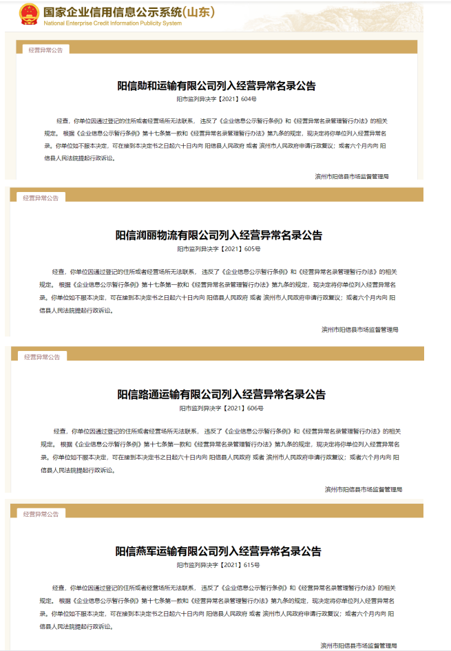 据阳市监列异决字【2021】604号、605号、606号、615号公告显示,阳信勋和运输有限公司(以下简称“勋和运输”)、阳信润丽物流有限公司(以下简称“润丽物流”)、阳信路通运输有限公司(以下简称“路通运输”)以及阳信燕军运输有限公司(以下简称“燕军运输”)因通过登记的住所或者经营场所无法联系,违反了相关规定,被阳信县市场监督管理局列入经营异常名录。