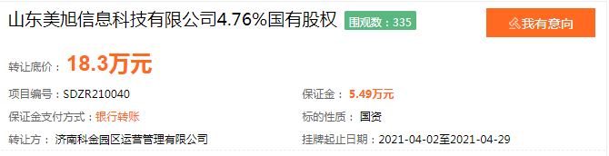 今日,鲁网·泰山财经记者从山东产权交易中心获悉,山东美旭信息科技有限公司(简称“美旭科技”)4.76%股权正被转让,转让底价为18.3万元,本次挂牌将于4月29日到期。鲁网·泰山财经记者注意到,转让方为济南历下控股集团有限公司(简称“历下控股”)旗下济南科金园区运营管理有限公司,系美旭科技唯一一家国企股东。