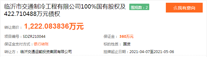 鲁网·泰山财经记者今日从山东产权交易中心了解到,临沂市人民政府国有资产监督管理委员会(简称“临沂市国资委”)全资企业临沂交通运输投资集团有限公司(简称“临沂交运集团”)公告表示,拟以1222.08万元底价,转让旗下临沂市交通制冷工程有限公司100%股权及422.71万元债权,转让时间截止至5月6日。