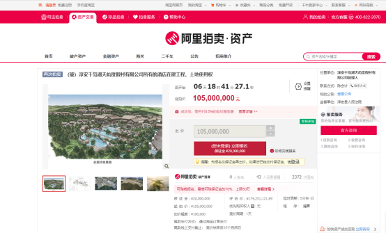 据公告显示,本次拍卖标的为淳安千岛湖天屿度假村有限公司(以下简称“天屿度假村”)所有的酒店在建工程、土地使用权,其中包括天屿度假村所有的位于杭州市淳安县阳光路天屿度假村的116间客房、相应面积的国有土地使用权和固定资产(样板房酒店用具)。公告称本次拍卖标的为整体现状拍卖。