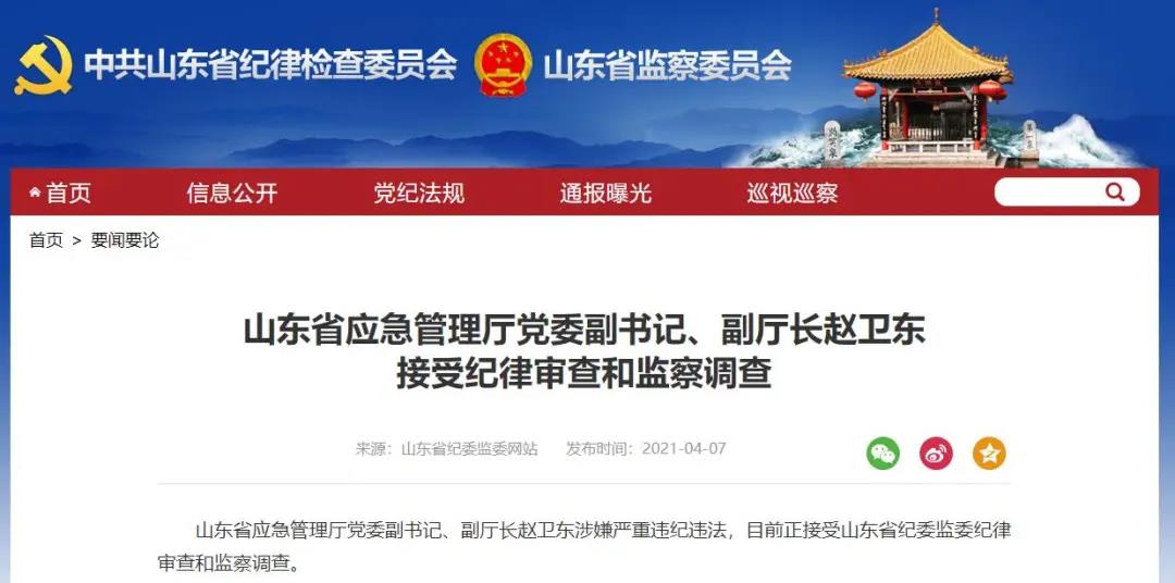 山东省应急管理厅党委副书记、副厅长赵卫东涉嫌严重违纪违法,目前正接受山东省纪委监委纪律审查和监察调查。