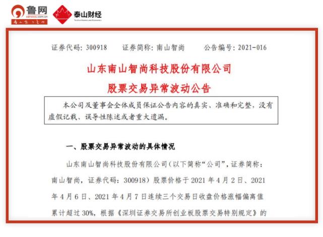 山东南山智尚科技股份有限公司(南山智尚.300918.SZ)发布股票交易异常波动公告称,公司股票价格于2021年4月2日、2021年4月6日、2021年4月7日连续三个交易日收盘价格涨幅偏离值累计超过30%,根据《深圳证券交易所创业板股票交易特别规定》的有关规定,属于股票交易异常波动的情况。
